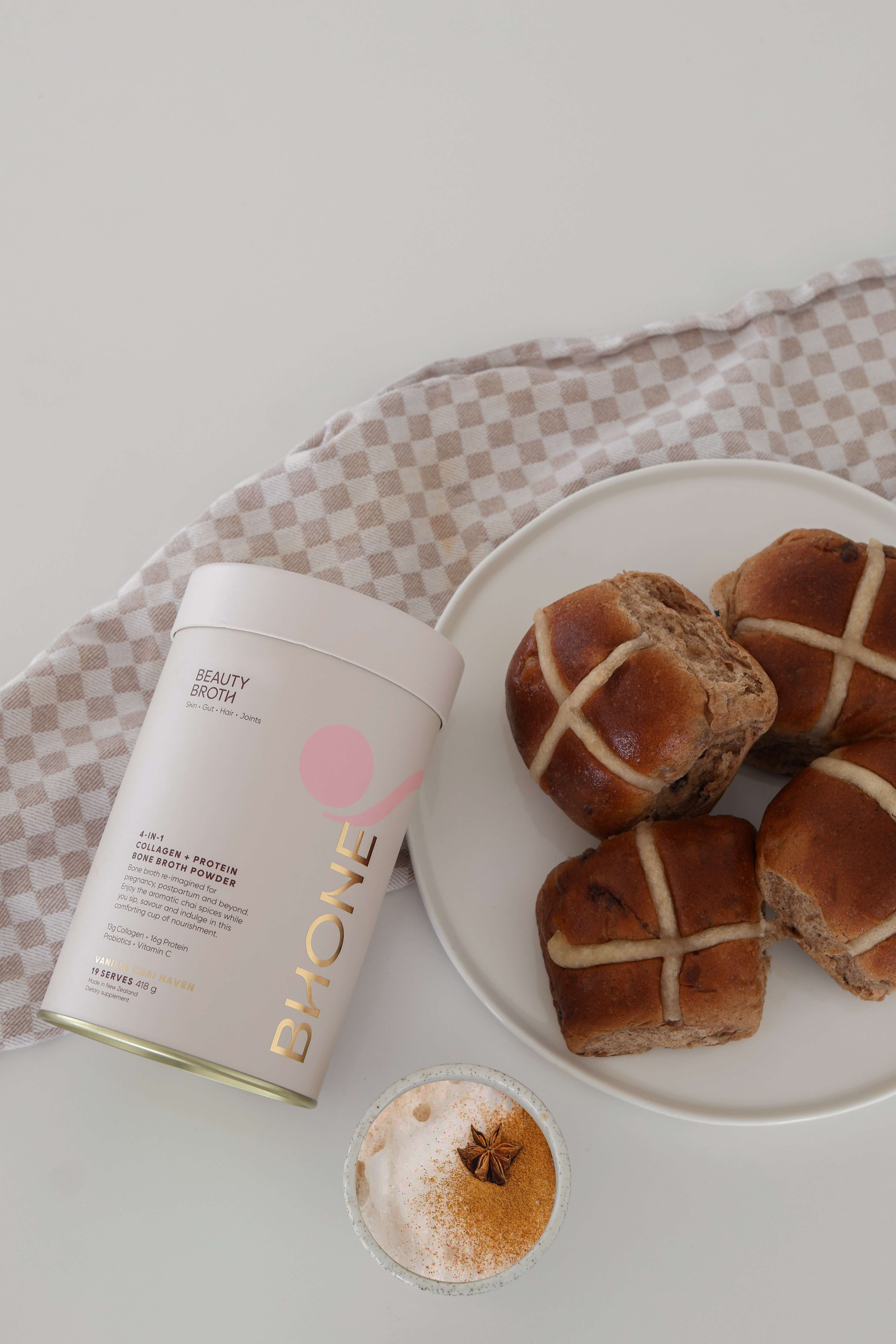 Bhone was created by a mother for mothers, and developed with scientists and microbiologists. It contains clinically studied nutrients and wholefoods to support gut health, glowing skin, sustained energy, and hair vitality.